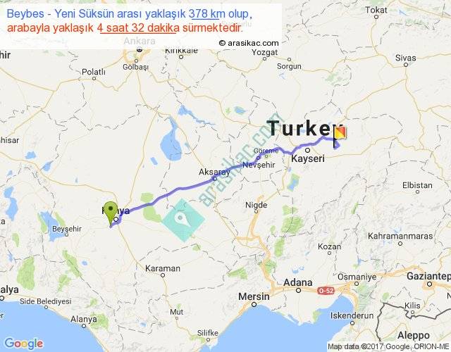 Beybes - Yeni Süksün arası yaklaşık olarak 90 km/h ile yukarıda belirtilen sürede olup, iki yerin kuş uçuşu uzaklığı (mesafesi) 321'dir. Eğer belirtilen yerler arasında uçak seferi var ise bu süre uçakla 29 dakika'ya kadar düşebilir. Yolculuk otobüsle 5 saat 53 dakika sürmektedir.
