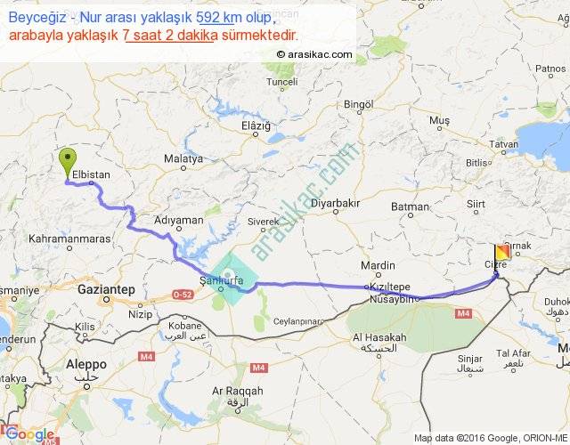 Beyceğiz - Nur arası yaklaşık olarak 90 km/h ile yukarıda belirtilen sürede olup, iki yerin kuş uçuşu uzaklığı (mesafesi) 472'dir. Eğer belirtilen yerler arasında uçak seferi var ise bu süre uçakla 43 dakika'ya kadar düşebilir. Yolculuk otobüsle 9 saat 8 dakika sürmektedir.