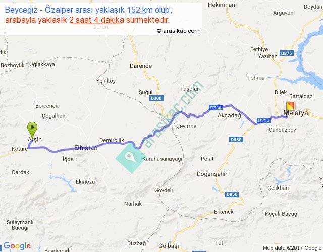 Beyceğiz - Özalper arası yaklaşık olarak 90 km/h ile yukarıda belirtilen sürede olup, iki yerin kuş uçuşu uzaklığı (mesafesi) 121'dir. Yolculuk otobüsle 2 saat 41 dakika sürmektedir.