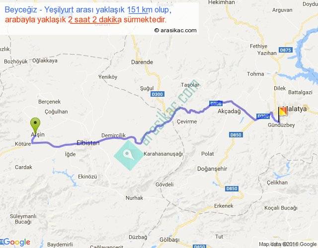 Beyceğiz - Yeşilyurt arası yaklaşık olarak 90 km/h ile yukarıda belirtilen sürede olup, iki yerin kuş uçuşu uzaklığı (mesafesi) 117'dir. Yolculuk otobüsle 2 saat 38 dakika sürmektedir.