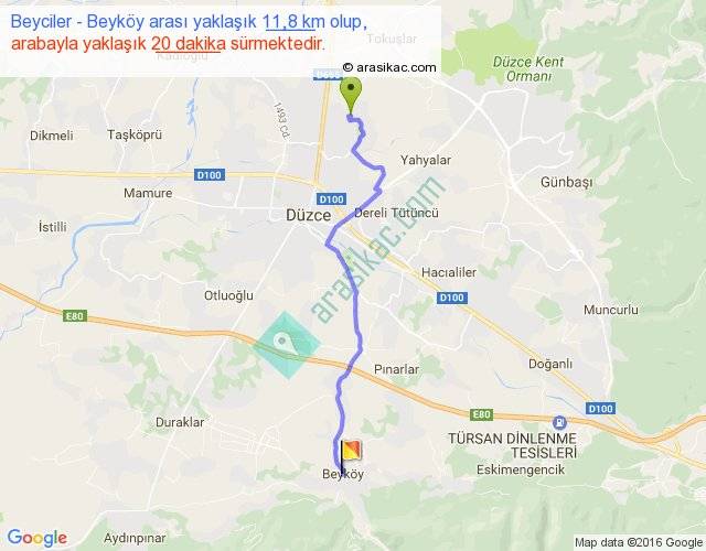 Beyciler - Beyköy arası yaklaşık olarak 90 km/h ile yukarıda belirtilen sürede olup, iki yerin kuş uçuşu uzaklığı (mesafesi) 9'dir. Yolculuk otobüsle 26 dakika sürmektedir.