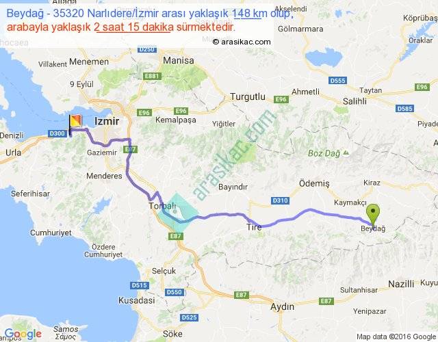 Beydağ - 35320 Narlıdere İzmir arası yaklaşık olarak 90 km/h ile yukarıda belirtilen sürede olup, iki yerin kuş uçuşu uzaklığı (mesafesi) 110'dir. Yolculuk otobüsle 2 saat 55 dakika sürmektedir.