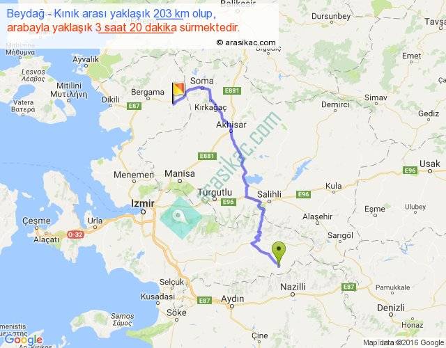 Beydağ - Kınık arası yaklaşık olarak 90 km/h ile yukarıda belirtilen sürede olup, iki yerin kuş uçuşu uzaklığı (mesafesi) 132'dir. Yolculuk otobüsle 4 saat 20 dakika sürmektedir.