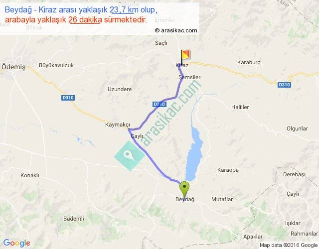 Beydağ - Kiraz arası yaklaşık olarak 90 km/h ile yukarıda belirtilen sürede olup, iki yerin kuş uçuşu uzaklığı (mesafesi) 16'dir. Yolculuk otobüsle 33 dakika sürmektedir.