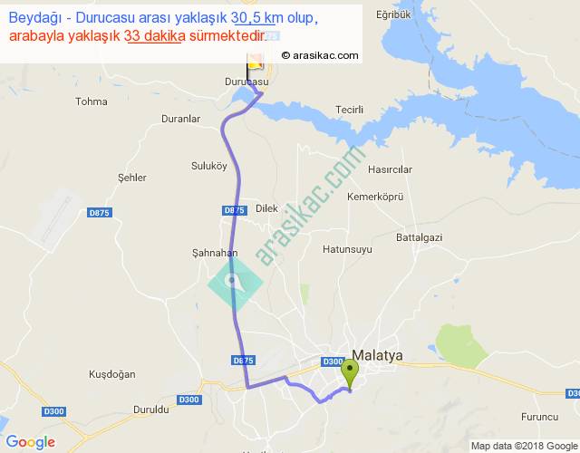 Beydağı - Durucasu arası yaklaşık olarak 90 km/h ile yukarıda belirtilen sürede olup, iki yerin kuş uçuşu uzaklığı (mesafesi) 21'dir. Yolculuk otobüsle 42 dakika sürmektedir.