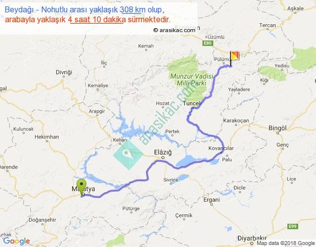 Beydağı - Nohutlu arası yaklaşık olarak 90 km/h ile yukarıda belirtilen sürede olup, iki yerin kuş uçuşu uzaklığı (mesafesi) 190'dir. Yolculuk otobüsle 5 saat 25 dakika sürmektedir.