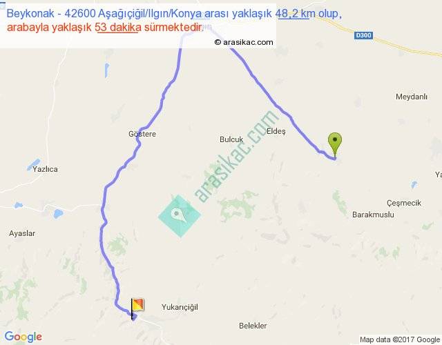 Beykonak - 42600 Aşağıçiğil Ilgın Konya arası yaklaşık olarak 90 km/h ile yukarıda belirtilen sürede olup, iki yerin kuş uçuşu uzaklığı (mesafesi) 22'dir. Yolculuk otobüsle 1 saat 8 dakika sürmektedir.