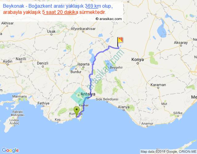 Beykonak - Boğazkent arası yaklaşık olarak 90 km/h ile yukarıda belirtilen sürede olup, iki yerin kuş uçuşu uzaklığı (mesafesi) 257'dir. Eğer belirtilen yerler arasında uçak seferi var ise bu süre uçakla 23 dakika'ya kadar düşebilir. Yolculuk otobüsle 6 saat 56 dakika sürmektedir.
