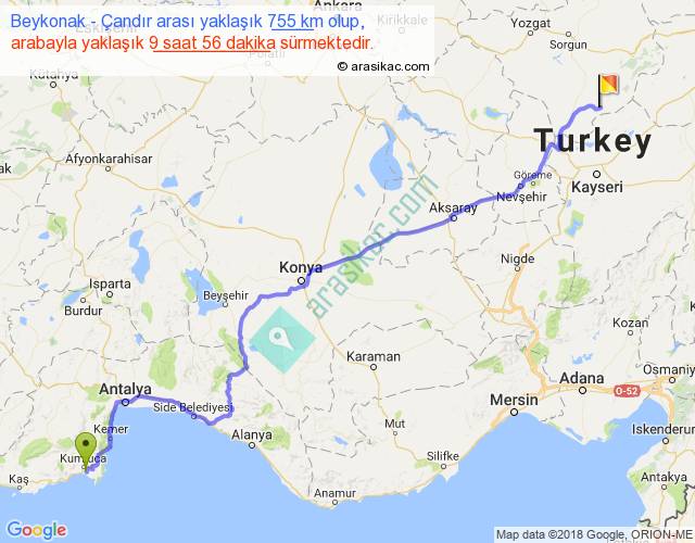 Beykonak - Çandır arası yaklaşık olarak 90 km/h ile yukarıda belirtilen sürede olup, iki yerin kuş uçuşu uzaklığı (mesafesi) 557'dir. Eğer belirtilen yerler arasında uçak seferi var ise bu süre uçakla 51 dakika'ya kadar düşebilir. Yolculuk otobüsle 12 saat 54 dakika sürmektedir.