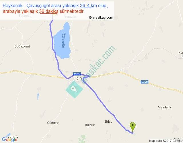Beykonak - Çavuşçugöl arası yaklaşık olarak 90 km/h ile yukarıda belirtilen sürede olup, iki yerin kuş uçuşu uzaklığı (mesafesi) 29'dir. Yolculuk otobüsle 50 dakika sürmektedir.