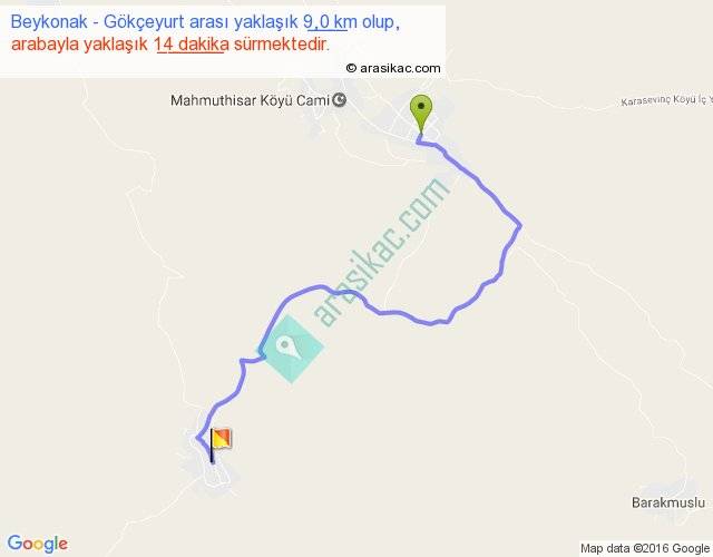 Beykonak - Gökçeyurt arası yaklaşık olarak 90 km/h ile yukarıda belirtilen sürede olup, iki yerin kuş uçuşu uzaklığı (mesafesi) 5'dir. Yolculuk otobüsle 18 dakika sürmektedir.