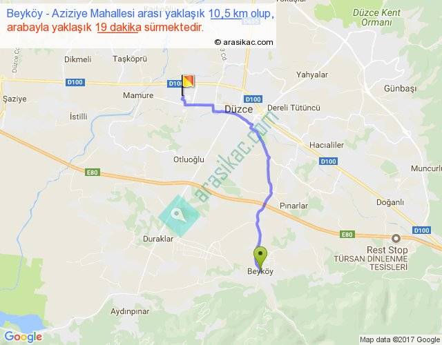 Beyköy - Aziziye Mahallesi arası yaklaşık olarak 90 km/h ile yukarıda belirtilen sürede olup, iki yerin kuş uçuşu uzaklığı (mesafesi) 8'dir. Yolculuk otobüsle 24 dakika sürmektedir.