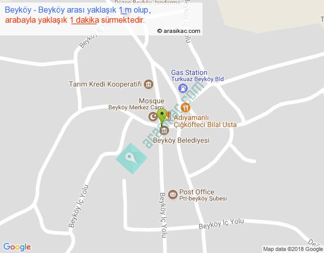 Beyköy - Beyköy arası yaklaşık olarak 90 km/h ile yukarıda belirtilen sürede olup, iki yerin kuş uçuşu uzaklığı (mesafesi) 0'dir. Yolculuk otobüsle 1 dakika sürmektedir.
