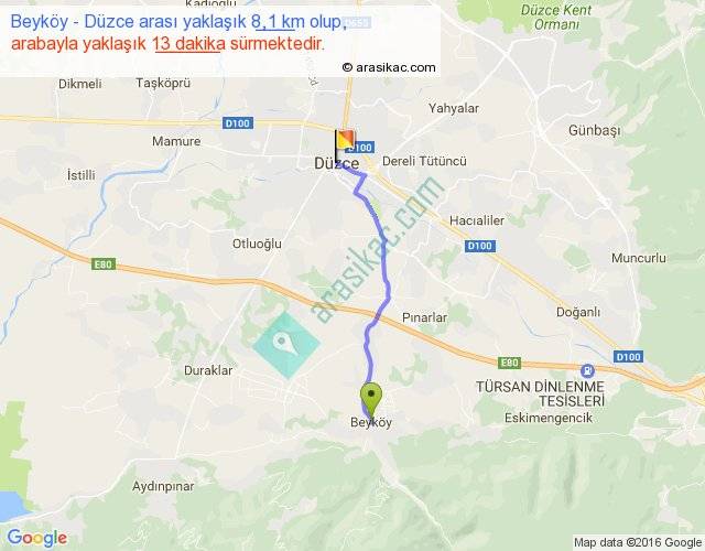 Beyköy - Düzce arası yaklaşık olarak 90 km/h ile yukarıda belirtilen sürede olup, iki yerin kuş uçuşu uzaklığı (mesafesi) 7'dir. Yolculuk otobüsle 16 dakika sürmektedir.