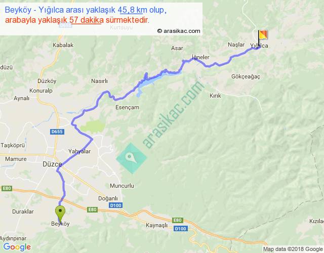 Beyköy - Yığılca arası yaklaşık olarak 90 km/h ile yukarıda belirtilen sürede olup, iki yerin kuş uçuşu uzaklığı (mesafesi) 30'dir. Yolculuk otobüsle 1 saat 14 dakika sürmektedir.
