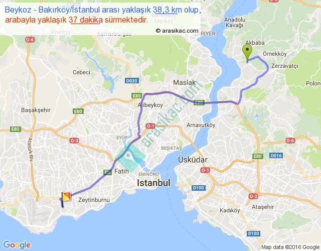 Beykoz - Bakırköy İstanbul arası yaklaşık olarak 90 km/h ile yukarıda belirtilen sürede olup, iki yerin kuş uçuşu uzaklığı (mesafesi) 27'dir. Yolculuk otobüsle 48 dakika sürmektedir.