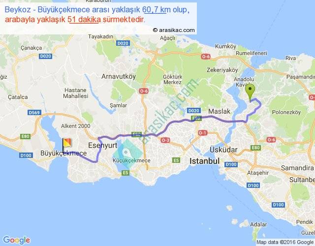 Beykoz - Büyükçekmece arası yaklaşık olarak 90 km/h ile yukarıda belirtilen sürede olup, iki yerin kuş uçuşu uzaklığı (mesafesi) 45'dir. Yolculuk otobüsle 1 saat 11 dakika sürmektedir.