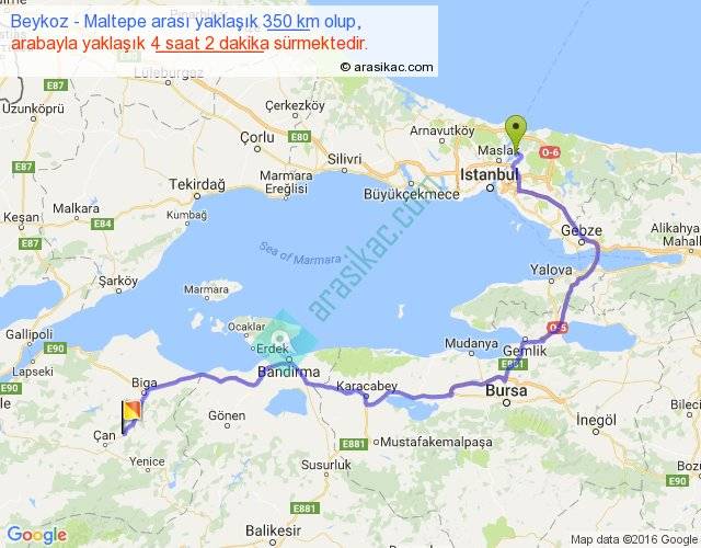Beykoz - Maltepe arası yaklaşık olarak 90 km/h ile yukarıda belirtilen sürede olup, iki yerin kuş uçuşu uzaklığı (mesafesi) 202'dir. Yolculuk otobüsle 5 saat 14 dakika sürmektedir.
