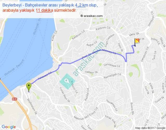 Beylerbeyi - Bahçelıevler arası yaklaşık olarak 90 km/h ile yukarıda belirtilen sürede olup, iki yerin kuş uçuşu uzaklığı (mesafesi) 3'dir. Yolculuk otobüsle 14 dakika sürmektedir.