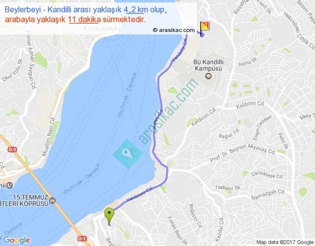 Beylerbeyi - Kandilli arası yaklaşık olarak 90 km/h ile yukarıda belirtilen sürede olup, iki yerin kuş uçuşu uzaklığı (mesafesi) 3'dir. Yolculuk otobüsle 14 dakika sürmektedir.