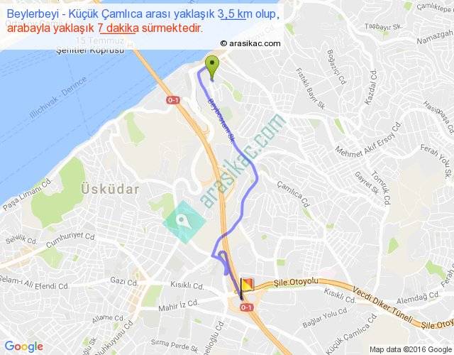 Beylerbeyi - Küçük Çamlıca arası yaklaşık olarak 90 km/h ile yukarıda belirtilen sürede olup, iki yerin kuş uçuşu uzaklığı (mesafesi) 2'dir. Yolculuk otobüsle 9 dakika sürmektedir.