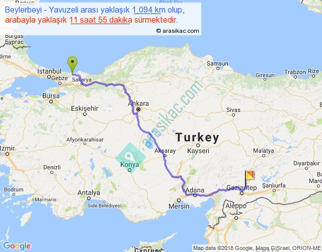 Beylerbeyi - Yavuzeli arası yaklaşık olarak 90 km/h ile yukarıda belirtilen sürede olup, iki yerin kuş uçuşu uzaklığı (mesafesi) 770'dir. Eğer belirtilen yerler arasında uçak seferi var ise bu süre uçakla 1 saat 11 dakika'ya kadar düşebilir. Yolculuk otobüsle 15 saat 29 dakika sürmektedir.