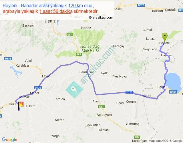 Beylerli - Baharlar arası yaklaşık olarak 90 km/h ile yukarıda belirtilen sürede olup, iki yerin kuş uçuşu uzaklığı (mesafesi) 68'dir. Yolculuk otobüsle 2 saat 30 dakika sürmektedir.