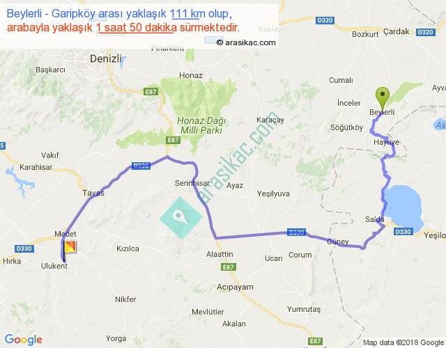 Beylerli - Garipköy arası yaklaşık olarak 90 km/h ile yukarıda belirtilen sürede olup, iki yerin kuş uçuşu uzaklığı (mesafesi) 61'dir. Yolculuk otobüsle 2 saat 23 dakika sürmektedir.
