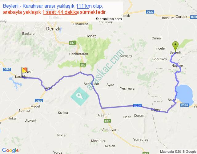 Beylerli - Karahisar arası yaklaşık olarak 90 km/h ile yukarıda belirtilen sürede olup, iki yerin kuş uçuşu uzaklığı (mesafesi) 61'dir. Yolculuk otobüsle 2 saat 15 dakika sürmektedir.