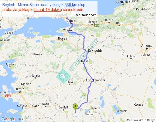Beylerli - Mimar Sinan arası yaklaşık olarak 90 km/h ile yukarıda belirtilen sürede olup, iki yerin kuş uçuşu uzaklığı (mesafesi) 366'dir. Eğer belirtilen yerler arasında uçak seferi var ise bu süre uçakla 33 dakika'ya kadar düşebilir. Yolculuk otobüsle 8 saat 12 dakika sürmektedir.