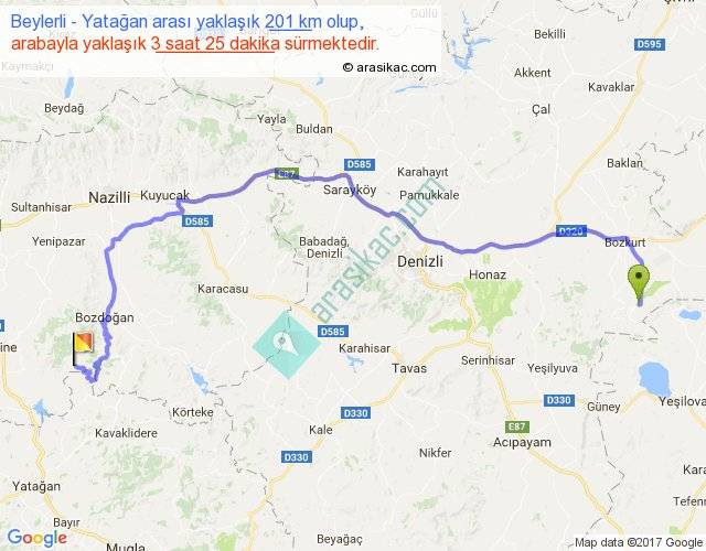 Beylerli - Yatağan arası yaklaşık olarak 90 km/h ile yukarıda belirtilen sürede olup, iki yerin kuş uçuşu uzaklığı (mesafesi) 123'dir. Yolculuk otobüsle 4 saat 26 dakika sürmektedir.