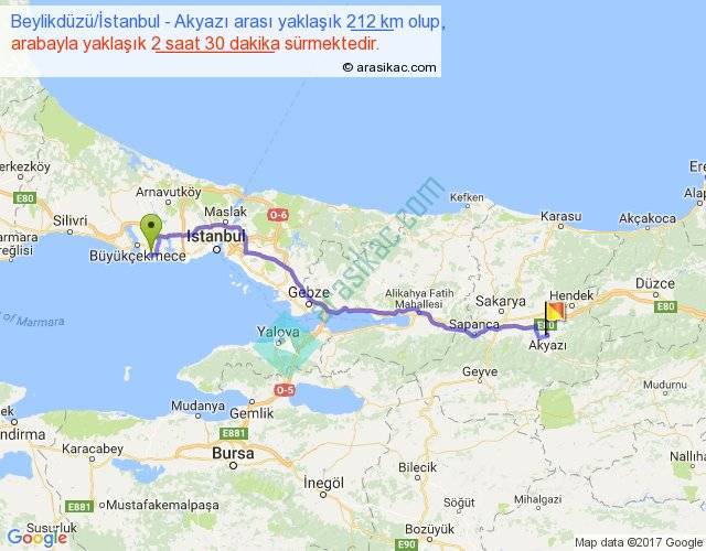 Beylikdüzü İstanbul - Akyazı arası yaklaşık olarak 90 km/h ile yukarıda belirtilen sürede olup, iki yerin kuş uçuşu uzaklığı (mesafesi) 169'dir. Yolculuk otobüsle 3 saat 15 dakika sürmektedir.