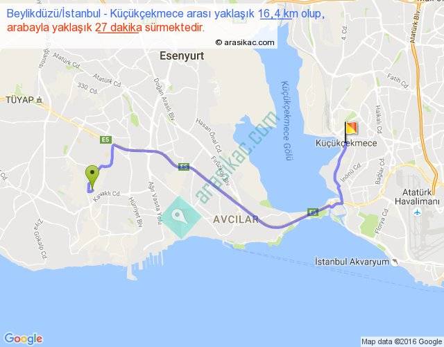 Beylikdüzü İstanbul - Küçükçekmece arası yaklaşık olarak 90 km/h ile yukarıda belirtilen sürede olup, iki yerin kuş uçuşu uzaklığı (mesafesi) 11'dir. Yolculuk otobüsle 35 dakika sürmektedir.