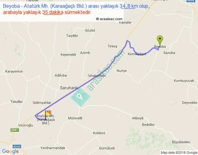 Beyoba - Atatürk Mh. (Karaağaçlı Bld.) arası yaklaşık olarak 90 km/h ile yukarıda belirtilen sürede olup, iki yerin kuş uçuşu uzaklığı (mesafesi) 26'dir. Yolculuk otobüsle 45 dakika sürmektedir.