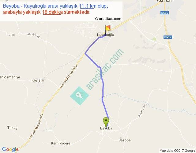 Beyoba - Kayalıoğlu arası yaklaşık olarak 90 km/h ile yukarıda belirtilen sürede olup, iki yerin kuş uçuşu uzaklığı (mesafesi) 9'dir. Yolculuk otobüsle 23 dakika sürmektedir.