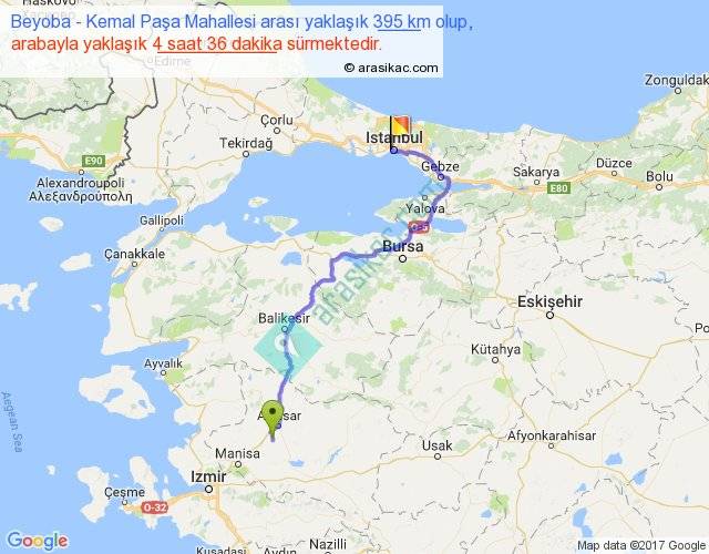 Beyoba - Kemal Paşa Mahallesi arası yaklaşık olarak 90 km/h ile yukarıda belirtilen sürede olup, iki yerin kuş uçuşu uzaklığı (mesafesi) 264'dir. Eğer belirtilen yerler arasında uçak seferi var ise bu süre uçakla 24 dakika'ya kadar düşebilir. Yolculuk otobüsle 5 saat 58 dakika sürmektedir.