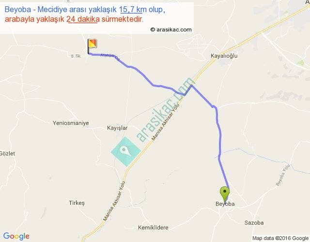 Beyoba - Mecidiye arası yaklaşık olarak 90 km/h ile yukarıda belirtilen sürede olup, iki yerin kuş uçuşu uzaklığı (mesafesi) 12'dir. Yolculuk otobüsle 31 dakika sürmektedir.