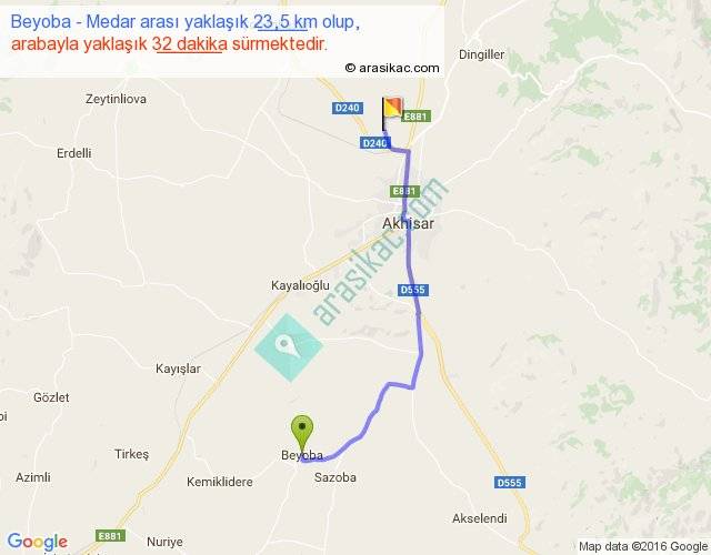 Beyoba - Medar arası yaklaşık olarak 90 km/h ile yukarıda belirtilen sürede olup, iki yerin kuş uçuşu uzaklığı (mesafesi) 18'dir. Yolculuk otobüsle 41 dakika sürmektedir.