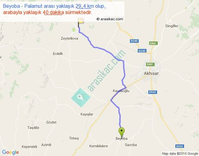 Beyoba - Palamut arası yaklaşık olarak 90 km/h ile yukarıda belirtilen sürede olup, iki yerin kuş uçuşu uzaklığı (mesafesi) 23'dir. Yolculuk otobüsle 52 dakika sürmektedir.