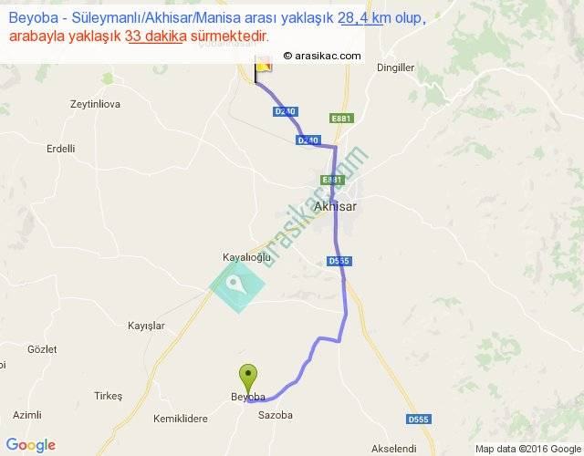 Beyoba - Süleymanlı Akhisar Manisa arası yaklaşık olarak 90 km/h ile yukarıda belirtilen sürede olup, iki yerin kuş uçuşu uzaklığı (mesafesi) 20'dir. Yolculuk otobüsle 42 dakika sürmektedir.