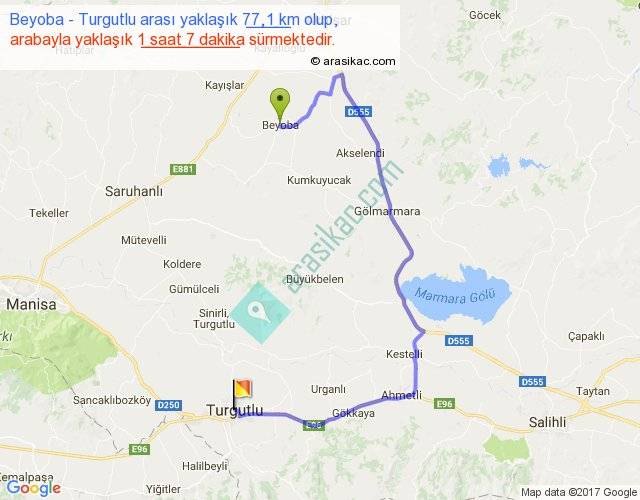 Beyoba - Turgutlu arası yaklaşık olarak 90 km/h ile yukarıda belirtilen sürede olup, iki yerin kuş uçuşu uzaklığı (mesafesi) 34'dir. Yolculuk otobüsle 1 saat 27 dakika sürmektedir.