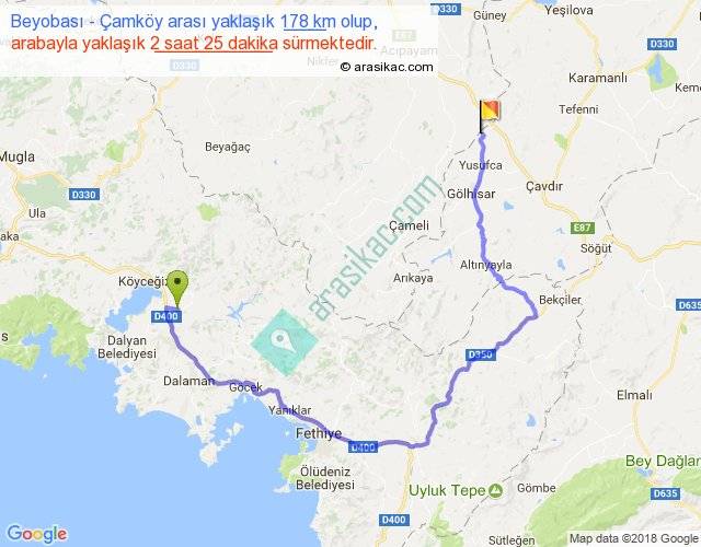 Beyobası - Çamköy arası yaklaşık olarak 90 km/h ile yukarıda belirtilen sürede olup, iki yerin kuş uçuşu uzaklığı (mesafesi) 78'dir. Yolculuk otobüsle 3 saat 8 dakika sürmektedir.