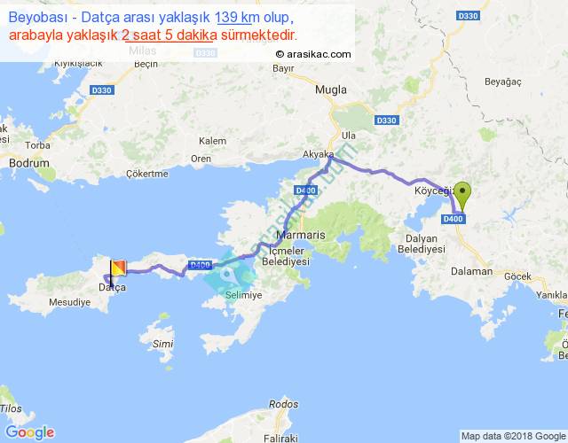 Beyobası - Datça arası yaklaşık olarak 90 km/h ile yukarıda belirtilen sürede olup, iki yerin kuş uçuşu uzaklığı (mesafesi) 98'dir. Yolculuk otobüsle 2 saat 42 dakika sürmektedir.