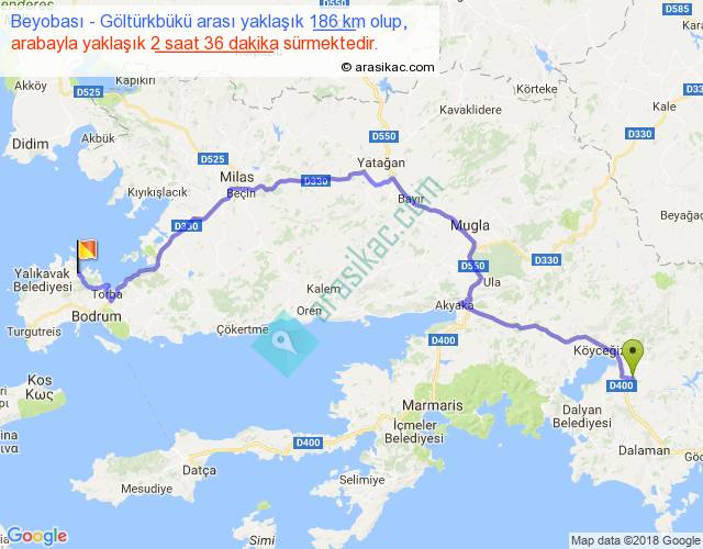 Beyobası - Göltürkbükü arası yaklaşık olarak 90 km/h ile yukarıda belirtilen sürede olup, iki yerin kuş uçuşu uzaklığı (mesafesi) 124'dir. Yolculuk otobüsle 3 saat 22 dakika sürmektedir.