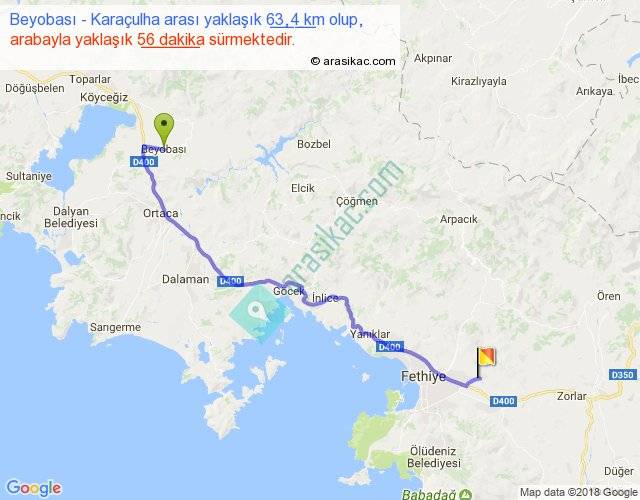 Beyobası - Karaçulha arası yaklaşık olarak 90 km/h ile yukarıda belirtilen sürede olup, iki yerin kuş uçuşu uzaklığı (mesafesi) 47'dir. Yolculuk otobüsle 1 saat 12 dakika sürmektedir.