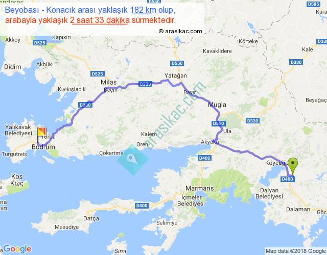 Beyobası - Konacık arası yaklaşık olarak 90 km/h ile yukarıda belirtilen sürede olup, iki yerin kuş uçuşu uzaklığı (mesafesi) 122'dir. Yolculuk otobüsle 3 saat 18 dakika sürmektedir.