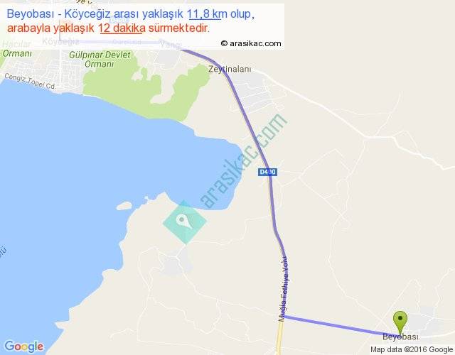 Beyobası - Köyceğiz arası yaklaşık olarak 90 km/h ile yukarıda belirtilen sürede olup, iki yerin kuş uçuşu uzaklığı (mesafesi) 10'dir. Yolculuk otobüsle 15 dakika sürmektedir.