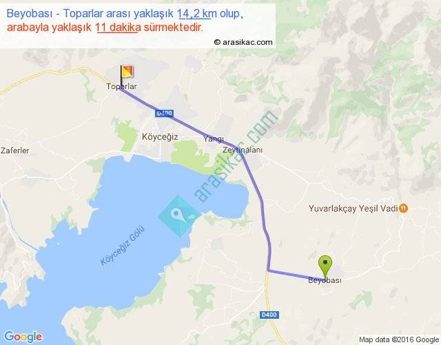 Beyobası - Toparlar arası yaklaşık olarak 90 km/h ile yukarıda belirtilen sürede olup, iki yerin kuş uçuşu uzaklığı (mesafesi) 12'dir. Yolculuk otobüsle 14 dakika sürmektedir.