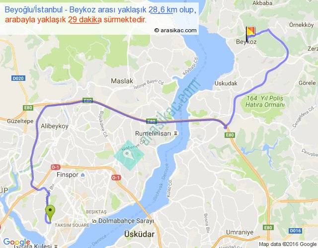 Beyoğlu İstanbul - Beykoz arası yaklaşık olarak 90 km/h ile yukarıda belirtilen sürede olup, iki yerin kuş uçuşu uzaklığı (mesafesi) 15'dir. Yolculuk otobüsle 37 dakika sürmektedir.