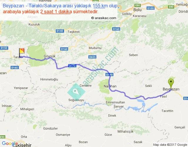 Beypazarı - Taraklı Sakarya arası yaklaşık olarak 90 km/h ile yukarıda belirtilen sürede olup, iki yerin kuş uçuşu uzaklığı (mesafesi) 122'dir. Yolculuk otobüsle 2 saat 37 dakika sürmektedir.